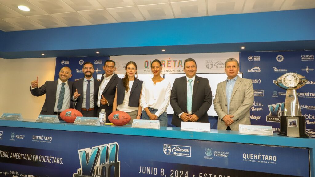 El próximo 8 de junio el Estadio La Corregidora de Querétaro será sede del “Tazón México”, el partido final de la Liga de Futbol Americano (LFA), donde se espera una afluencia de más de 20 mil aficionados y una derrama económica de entre 35 y 40 millones de pesos para la ciudad capital, así lo dieron a conocer autoridades estatales, directivos de la liga y del equipo queretano “Gallos Negros”.
