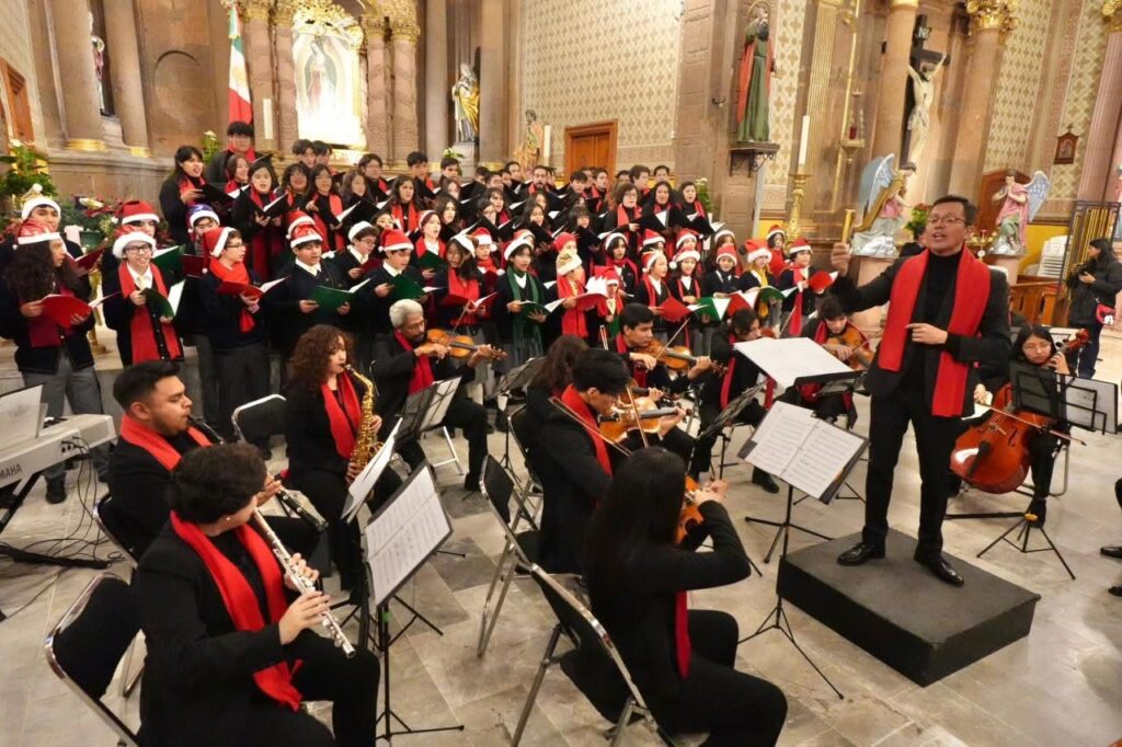 Se presentó el coro y la orquesta del Conservatorio de Música José Guadalupe Velázquez A.C. con especial repertorio navideño, al interior del Santuario Diocesano de Nuestra Señora de Guadalupe.